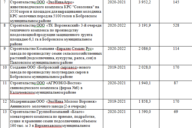 В этом году в АПК Воронежской области начнут свою работу два молочных комплекса компании «ЭкоНиваАгро» в Бобровском и Лискинском районах с общим поголовьем более 7 тыс. коров; мясокомбинат группы компаний «Агроэко» в Павловском районе, а также вторая очередь модернизации Аннинского молочного завода (ООО «ЭкоНива Молоко Воронеж»).