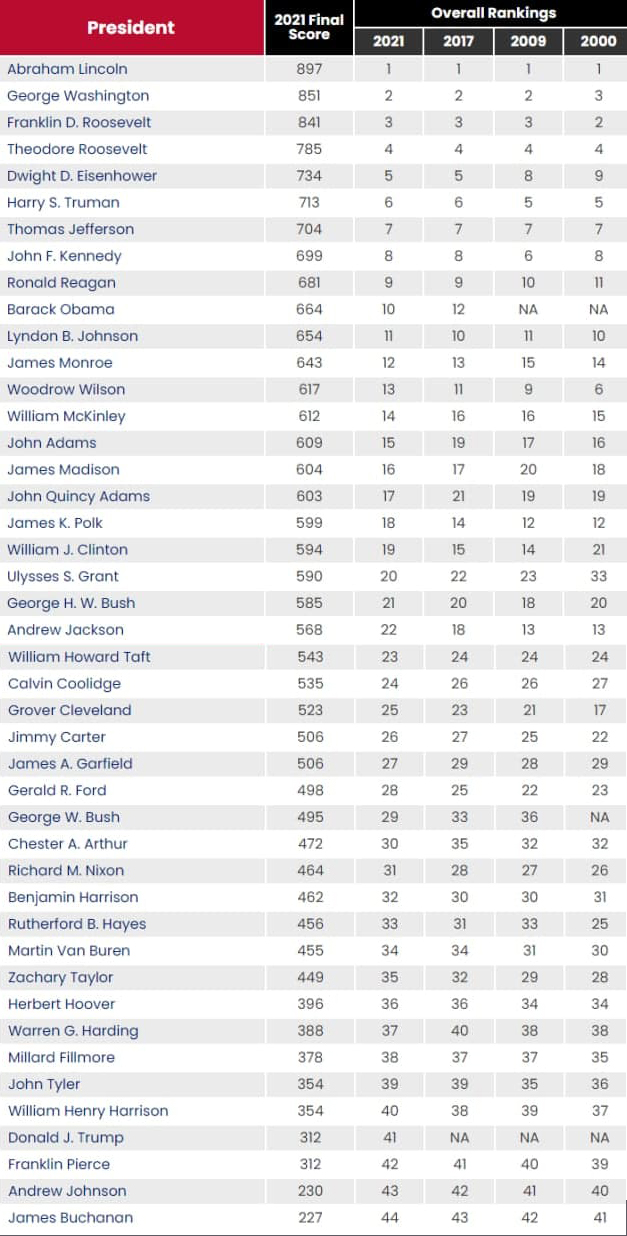 Стоит отметить, что в рейтинге 44 строчки, так как Гровер Кливленд становился президентом дважды и был 22-м и 24-м президентом США.